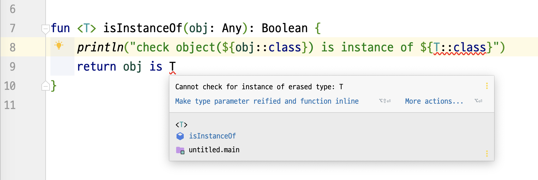 fun <T> isInstanceOf(obj: Any): Boolean {