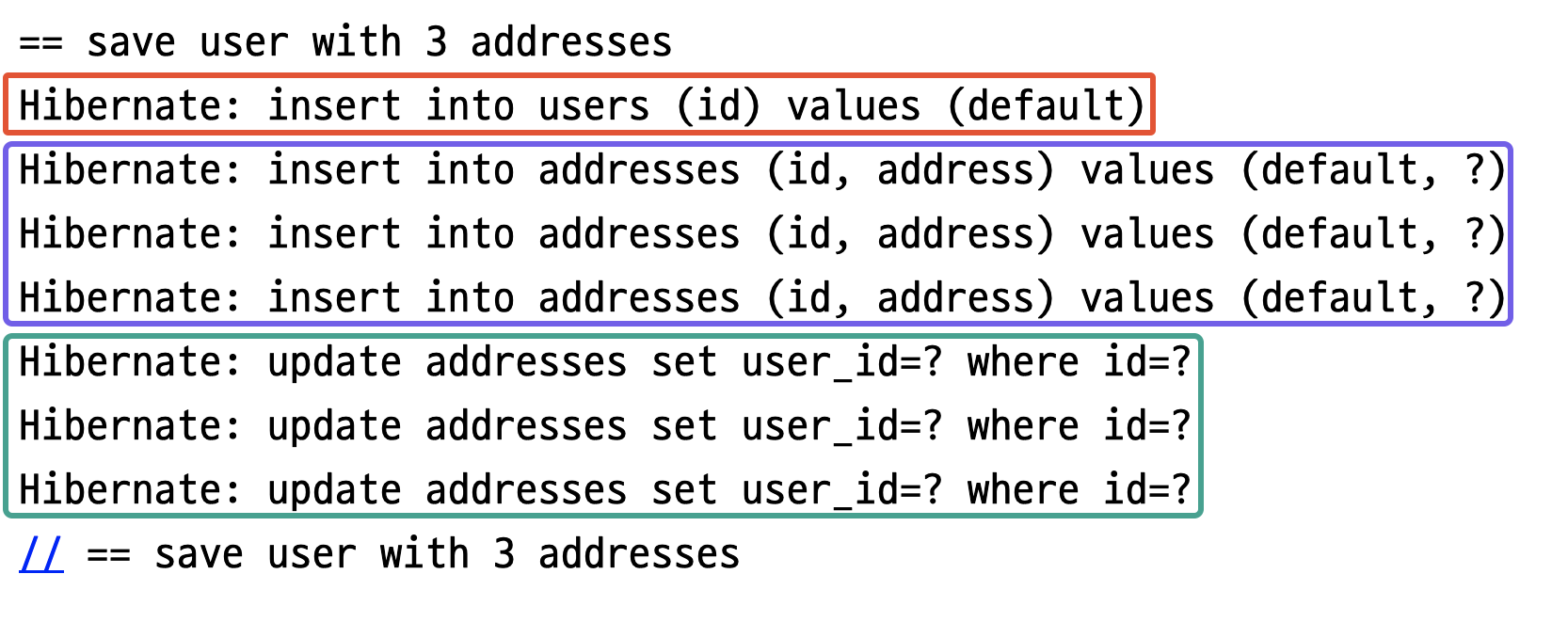 System.out.println("// == save user with 3 addresses");