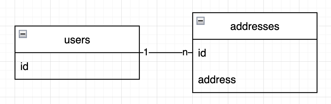 유저가 여러 주소를 가질 수 있음을 다음과 같이 RDMBS의 user table과 address table로 나타낼 수 있다.