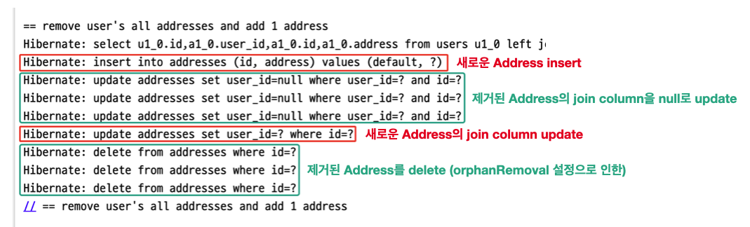 user.removeAllAddresses() // 하위 Entity 모두 제거 (3개 저장되어있음)