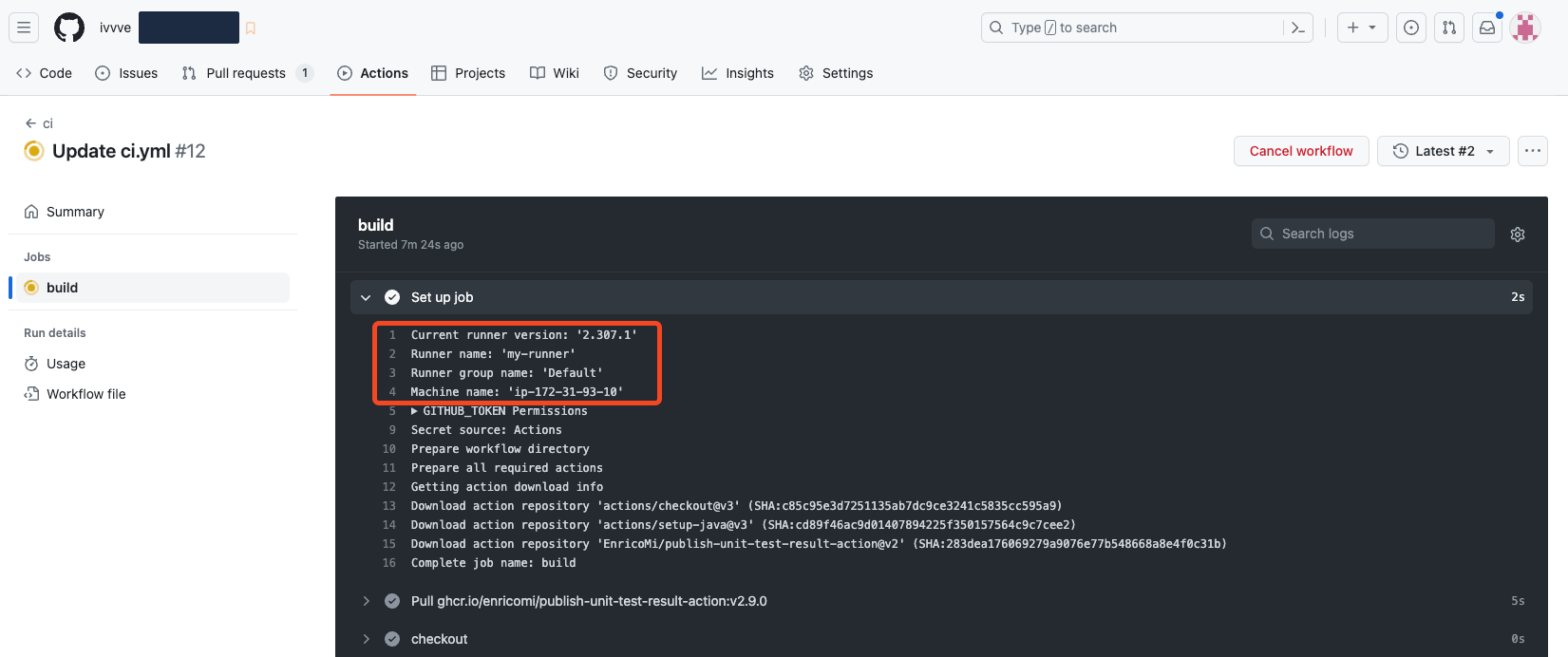 7. action을 실행하여 정상적으로 self-hosted runner를 사용하는지를 확인한다.