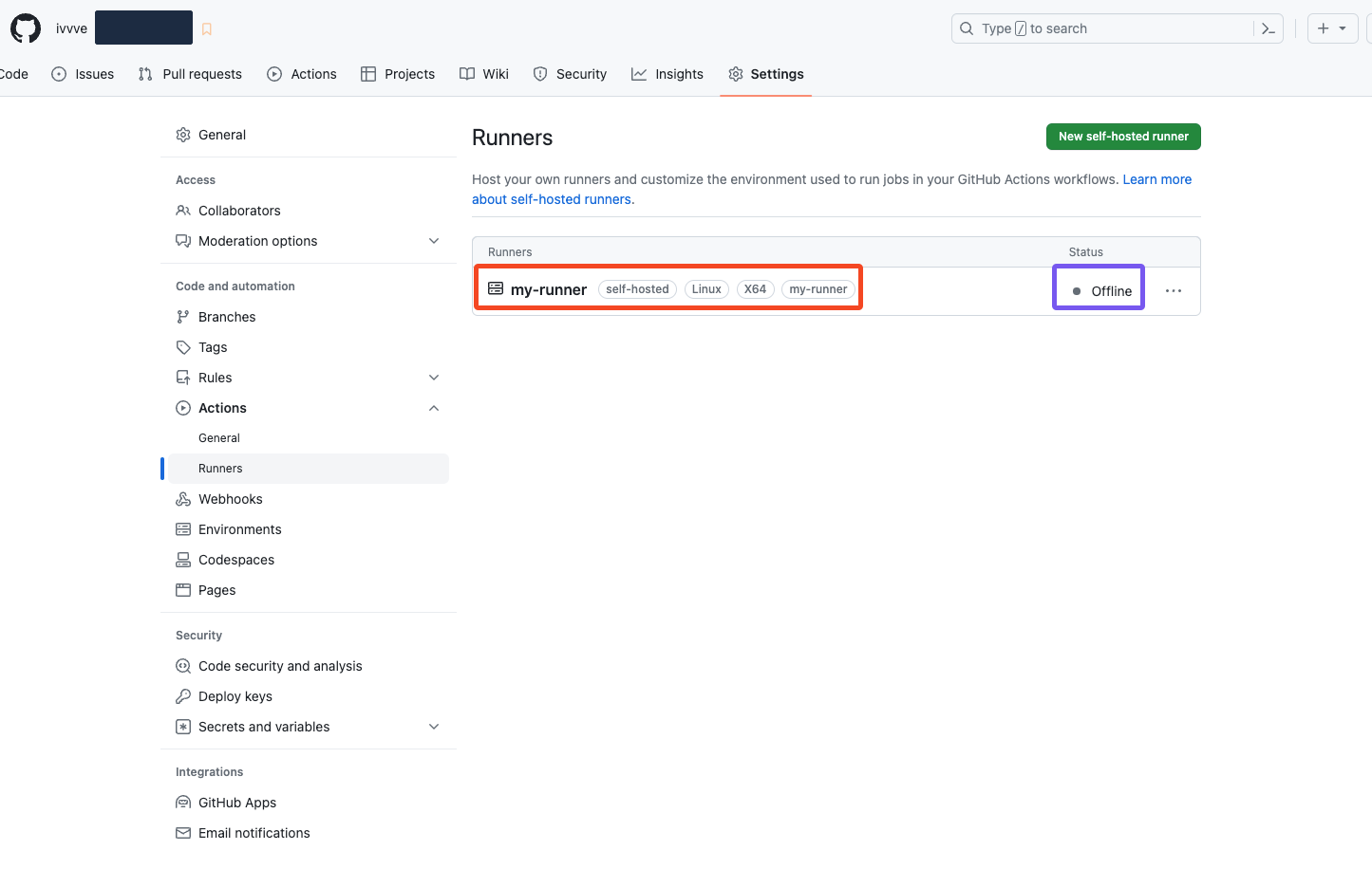 runner 설치는 하였지만 실행을 하지않아 Status가 Offline이다.