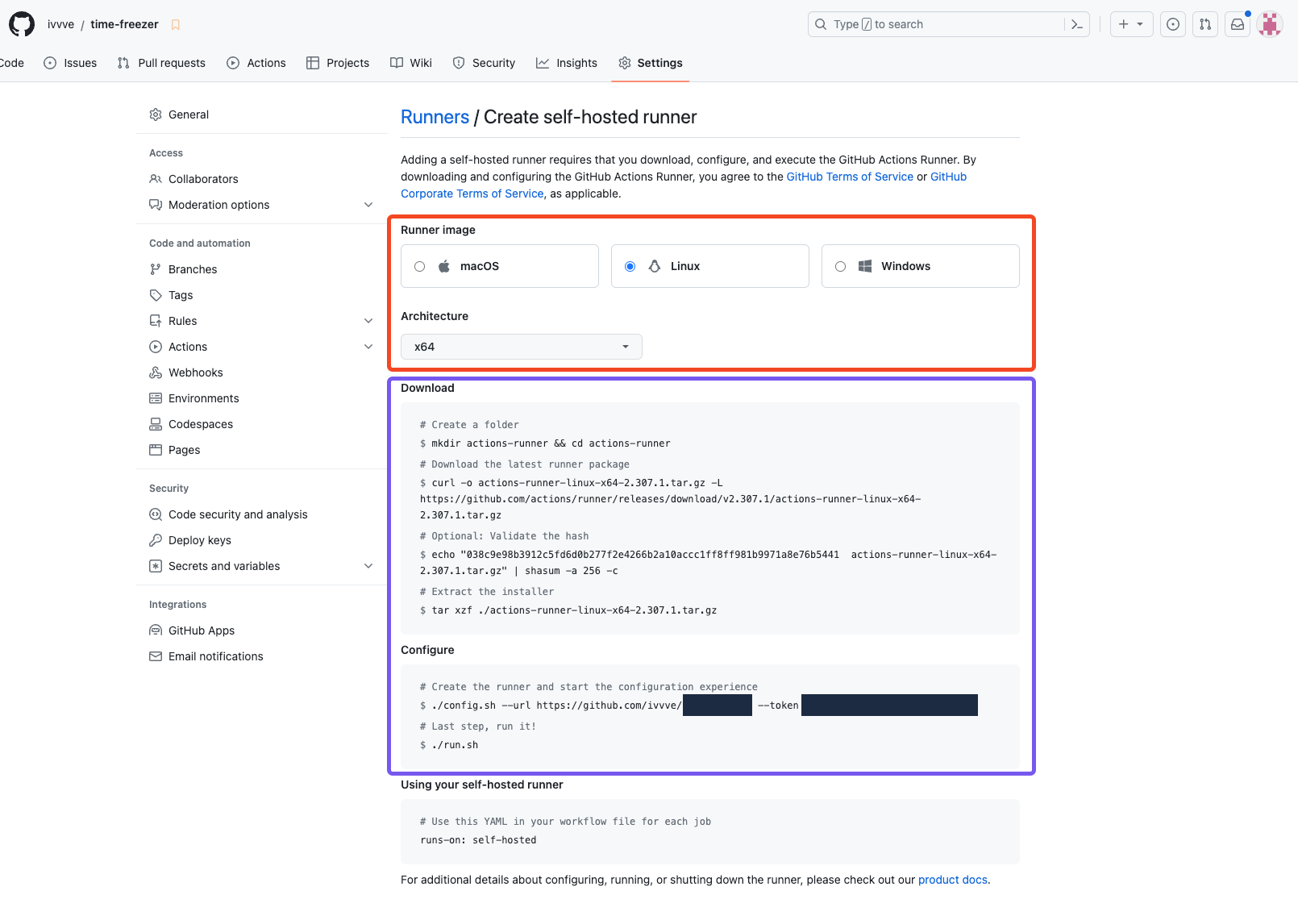 ● self-hosted runner가 구성될 서버의 환경을 선택한 뒤