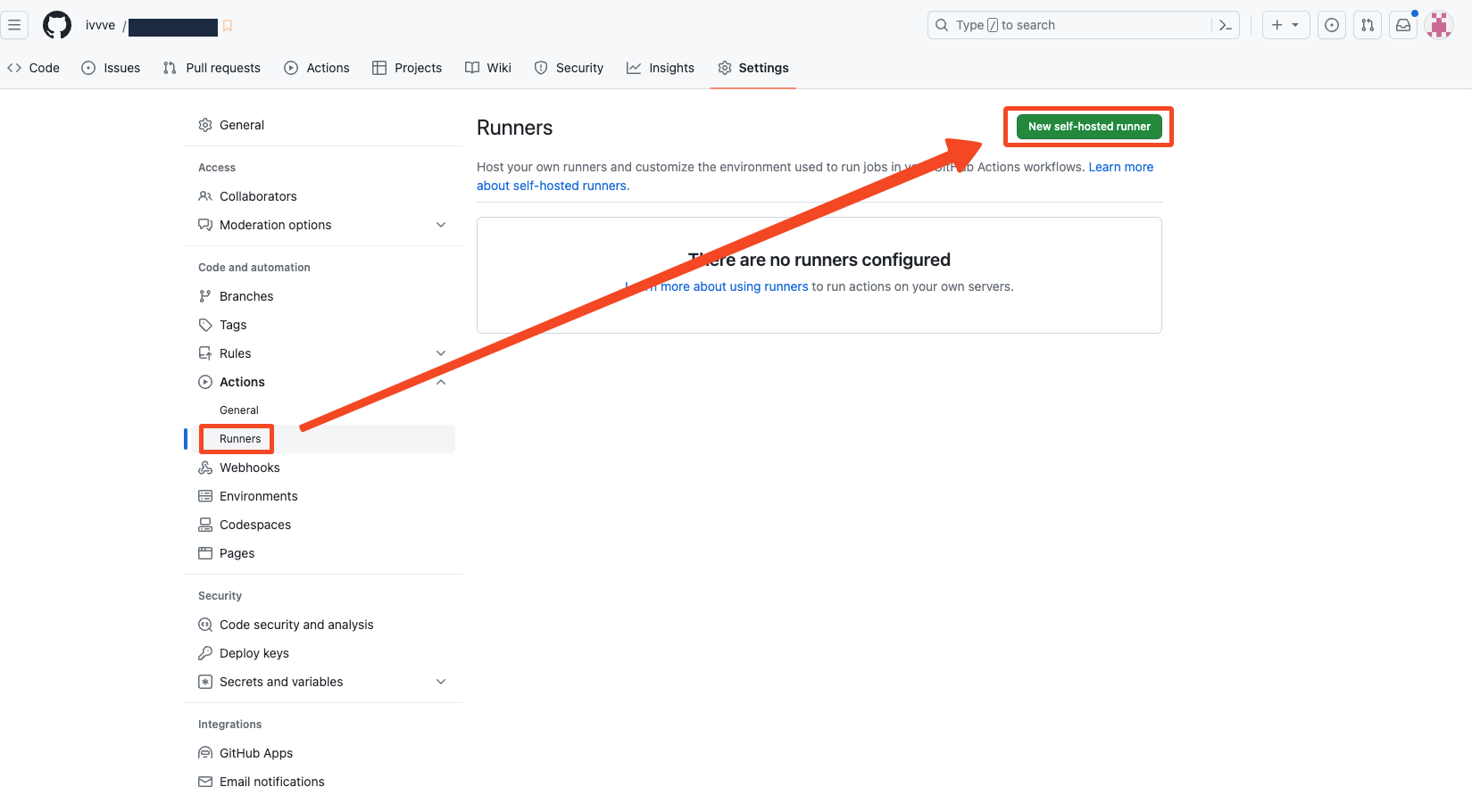 1. self-hosted runner를 구성하고자 하는 repository에서 Settings > Runners에 들어가서 New self-hosted runner 버튼을 클릭한다.