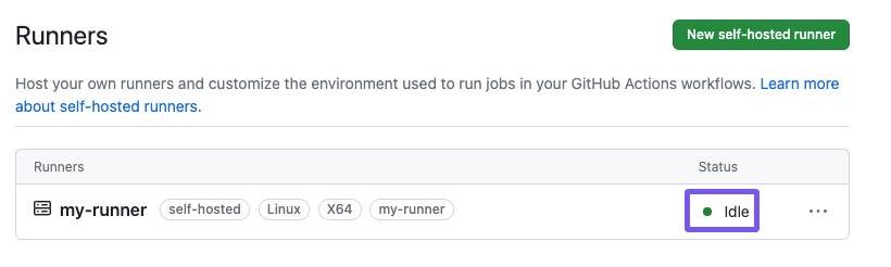 정상적으로 runner가 실행되었다면 아래와 같이 Status가 Idel 상태로 변경될 것이다.