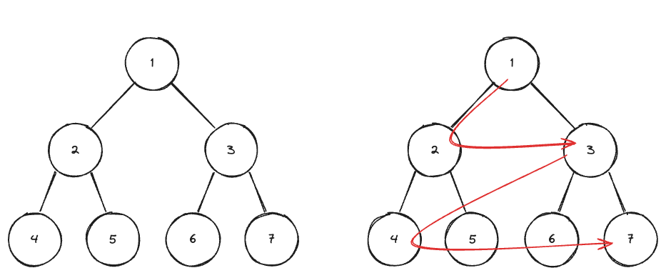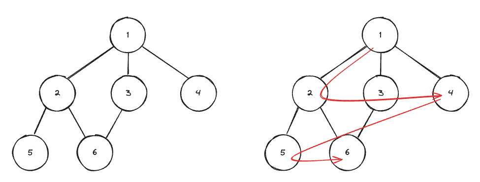 Graph가 좌측에 있는 그림과 같은 형태라고 하면, 우측의 화살표 순으로 탐색을 해야한다.