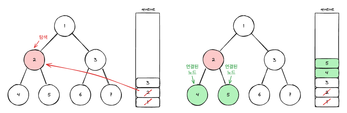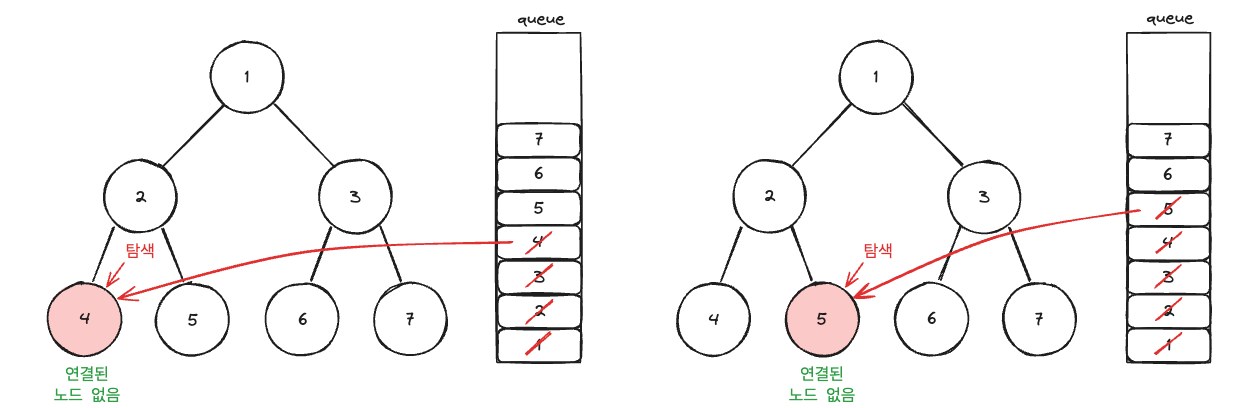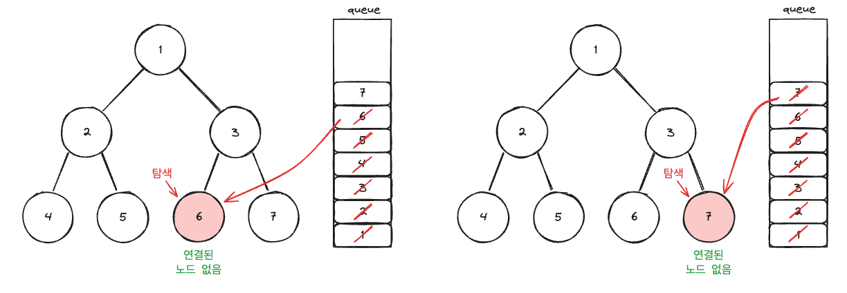 하지만 leaf node 이기 때문에 추가로 탐색할 노드가 없어 queue에 node를 추가하지 않는다.