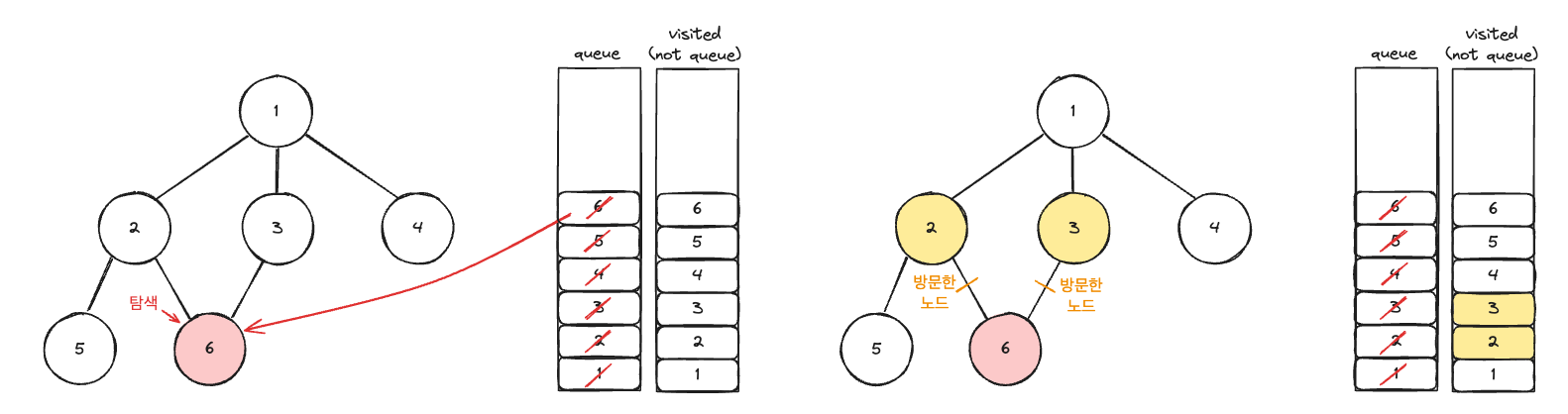 (오른쪽) 탐색한 뒤 node6와 연결된 node들(node2, node3)을 탐색해야할 node queue에 추가한다.