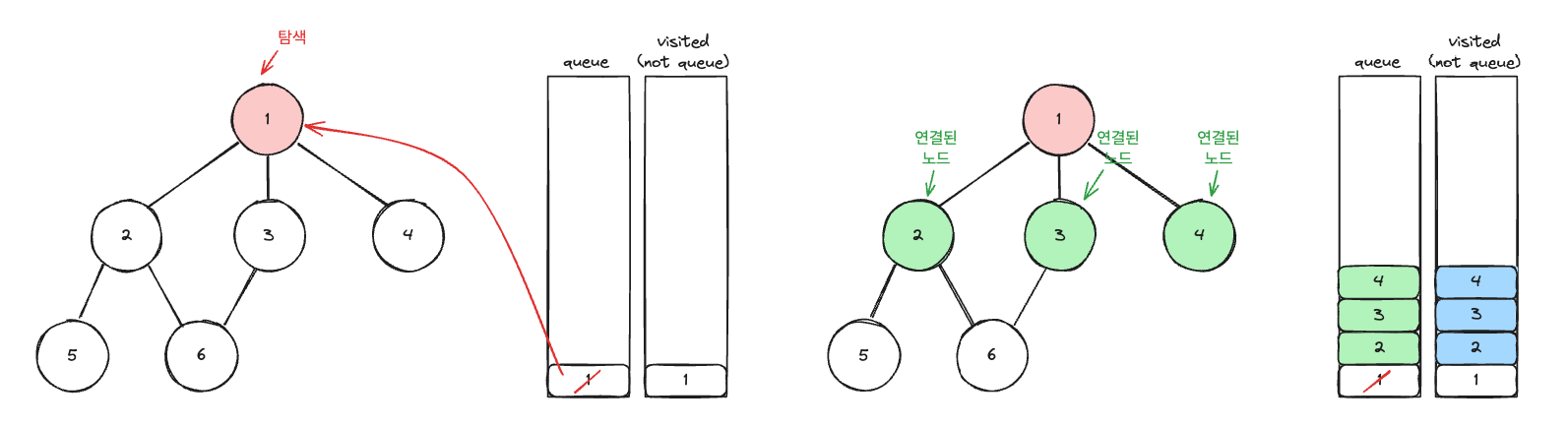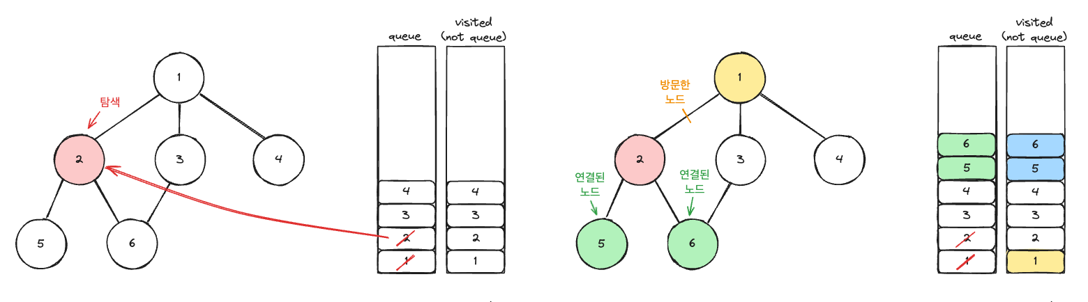 BFS의 경우 DFS와 달리 재귀적으로 처리되지 않고 queue를 사용하여 탐색할 노드의 순서를 저장한다.