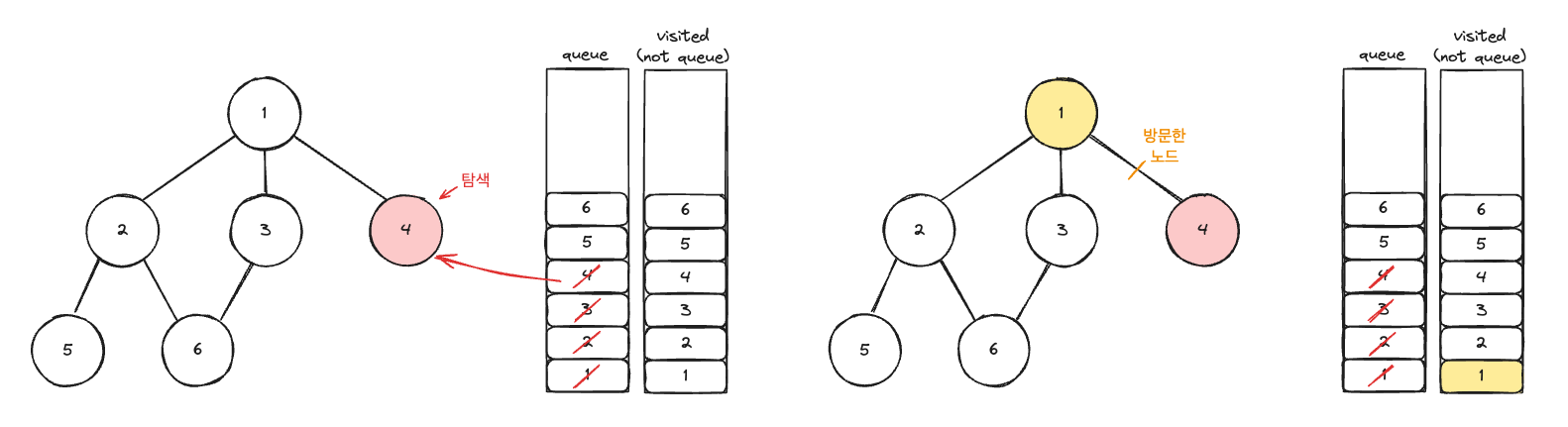 (오른쪽) 탐색한 뒤 node4와 연결된 node들(node1)을 탐색해야할 node queue에 추가한다.