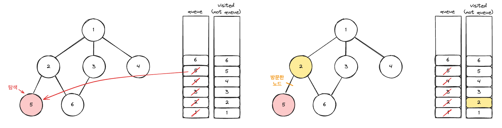 (오른쪽) 탐색한 뒤 node5와 연결된 node들(node2)을 탐색해야할 node queue에 추가한다.