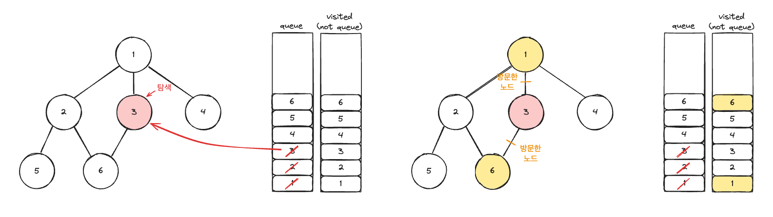 (오른쪽) 탐색한 뒤 node3와 연결된 node들(node1, node6)을 탐색해야할 node queue에 추가한다.