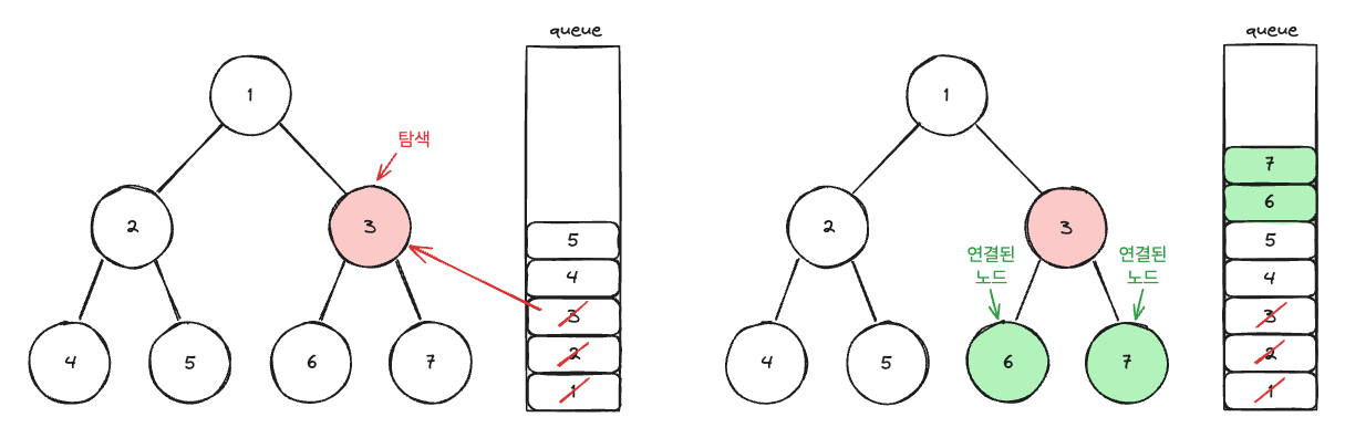 (오른쪽) 탐색한 뒤 node3과 연결된 node들(node6, node7)을 탐색해야할 node queue에 추가한다.