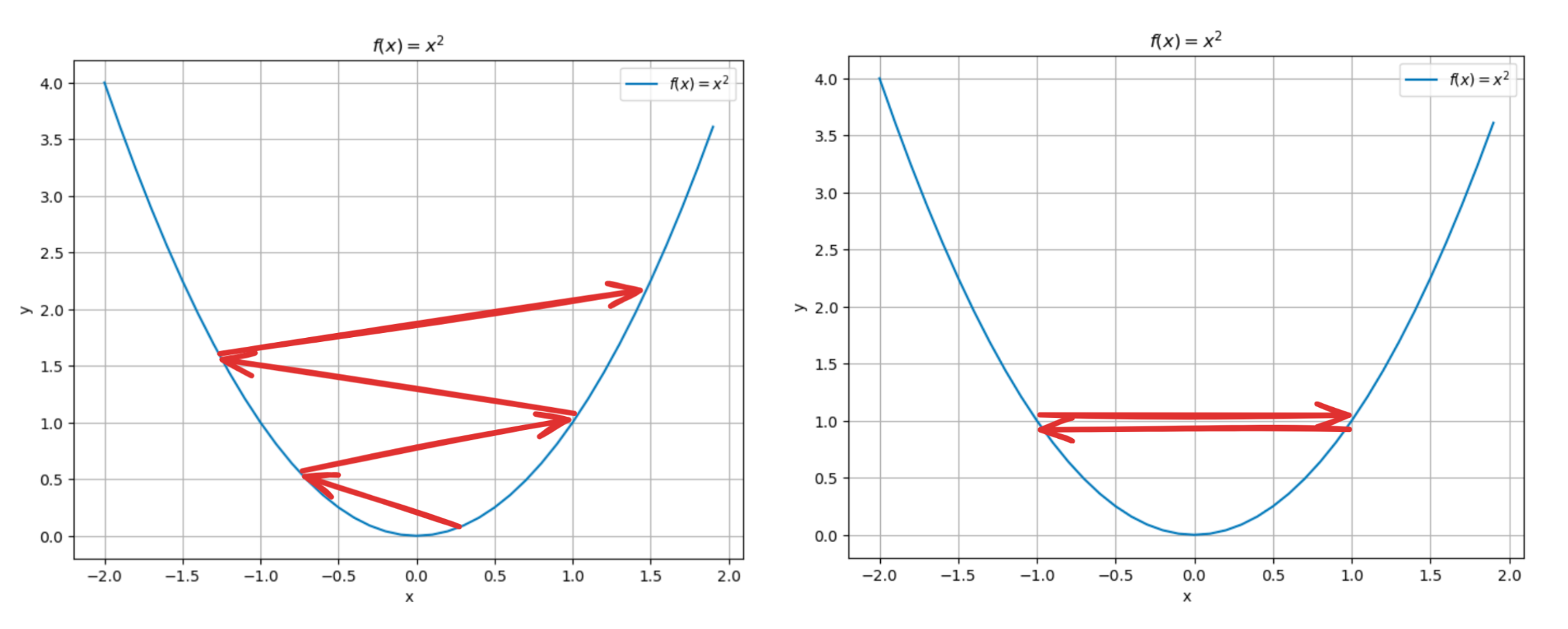이렇듯 이렇듯 단순히 현재 좌표에서 gradient를 빼면, 함수에 따라 gradient의 크기가 큰 경우가 있기 때문에 최소값을 제대로 찾을 수 없는 케이스도 있게된다.
