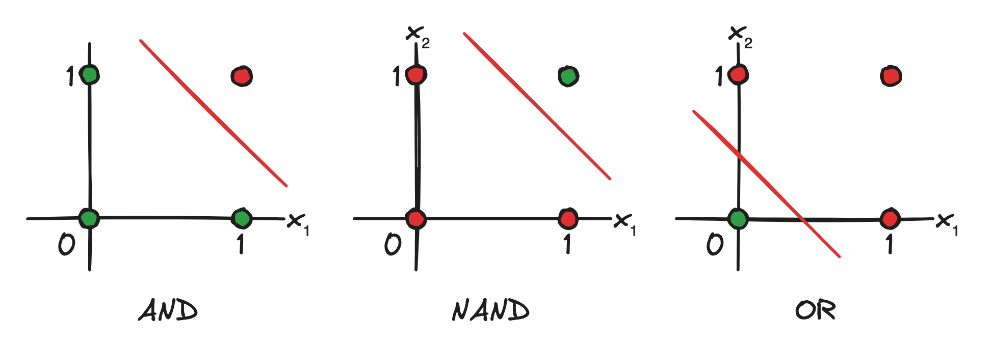 AND, NAND, OR gate 같은 경우 아래와 같이 $x_1, x_2$ 에 대해 직선(한 층의 perceptron)을 통해 출력을 구분할 수 있다.