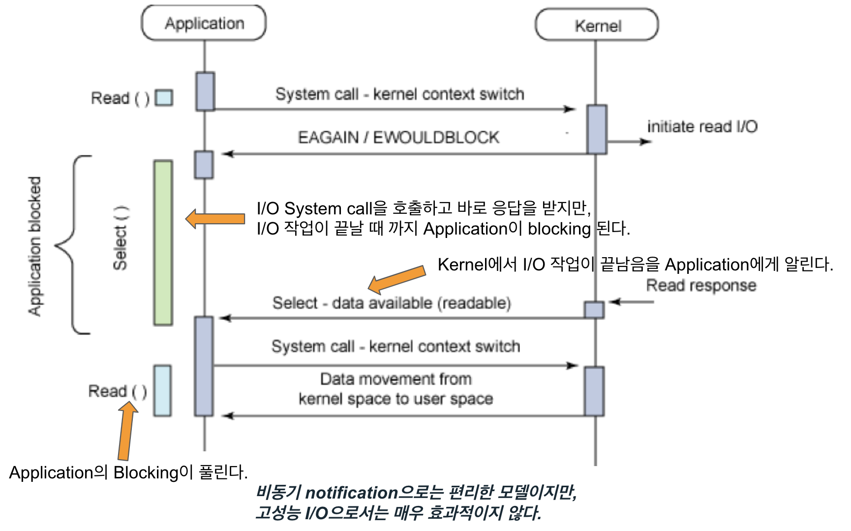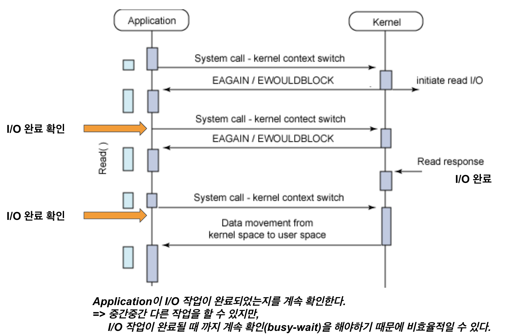 하지만 Application이 I/O 작업이 끝났음을 알기 위해서 Application이 주기적으로 I/O 작업이 완료되었는지를 확인(Sync)해야한다.