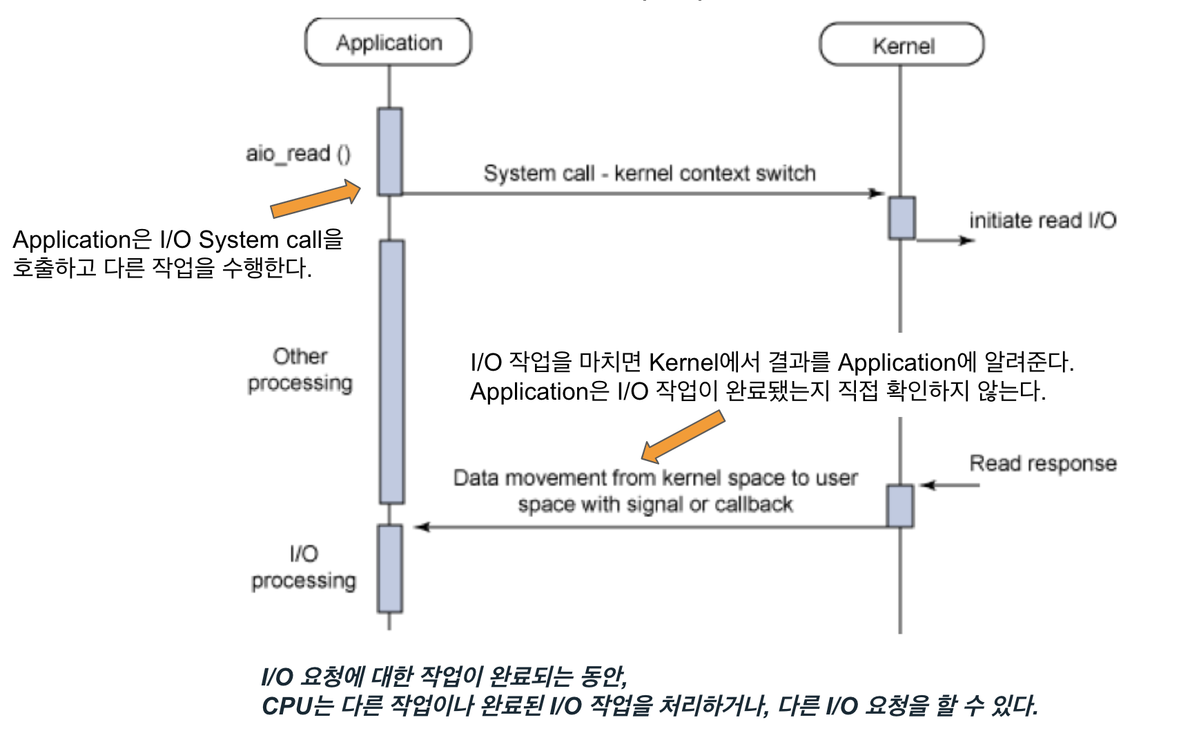 I/O 작업이 완료되면 Kernel이 Application에게 I/O 작업 완료 signal을 보낸다(Async).