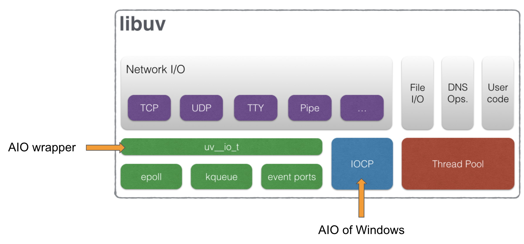 Windows의 경우 IOCP라는 Async I/O를 지원하는데, Windows가 아닌 경우 epoll, kqueue 등을 사용하여 Async I/O를 구현한 uv__io_t라는 AIO Wrapper를 사용한다.