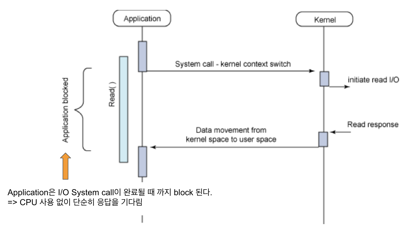 Application이 I/O 함수를 호출했을 때 I/O 작업이 완료될 때 까지 blocking이 된다.