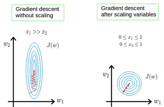 각 피쳐의 스케일을 맞추는 것은 경사하강법을 통한 학습에 있어서 경사의 수렴(convergence)을 더 빠르게 해준다.