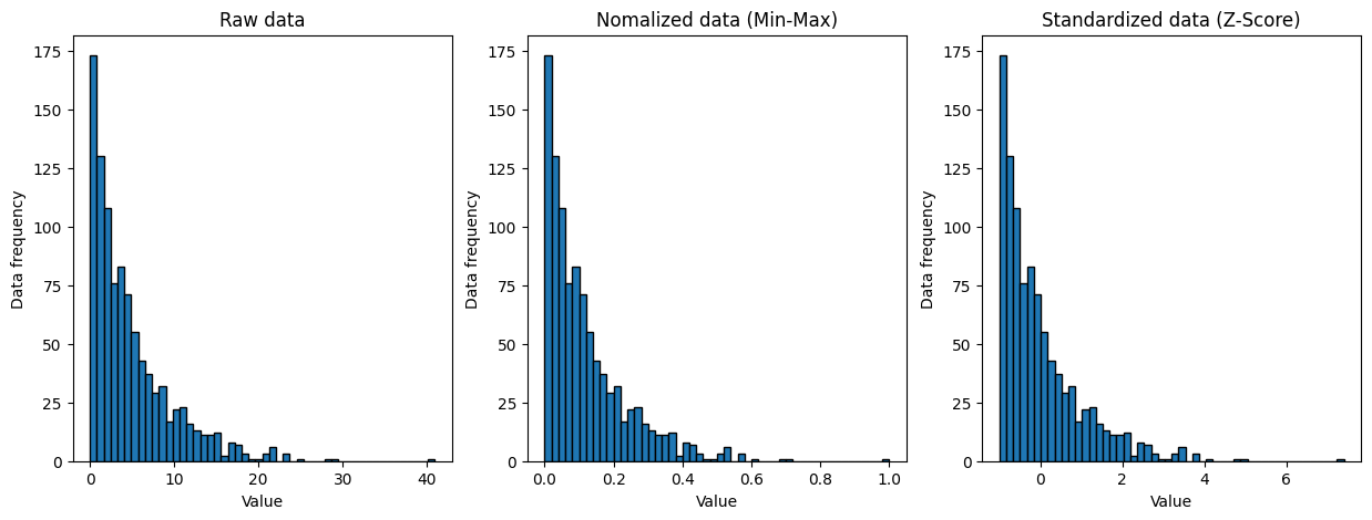 아래 데이터의 정규화, 표준화에 따른 분표 변화를 나타낸 것인데, scale은 변화가 있지만 분포 양상은 변하지 않는 것을 확인할 수 있다.