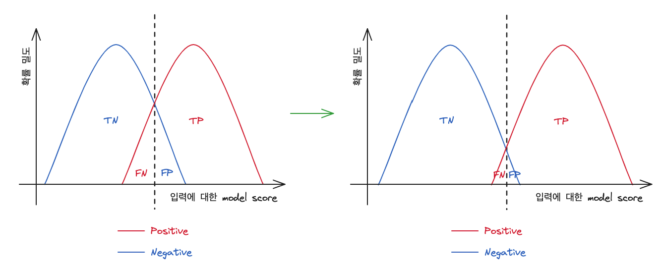 ROC Curve 그래프를 이진 분류기 모델의 각 클래스에 대한 분류 확률 밀도 그래프와 함께 보면 아래와 같다.