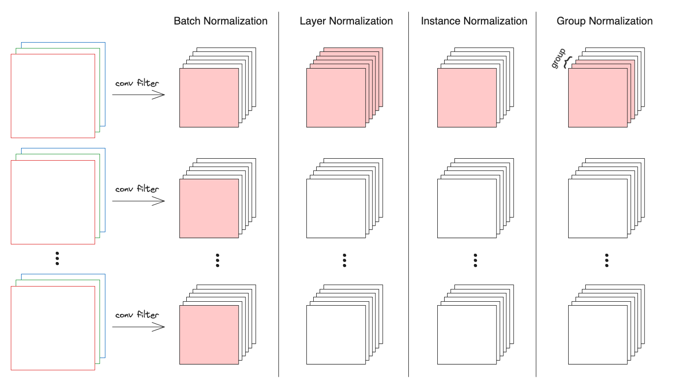 feature map에 대해 각각 normalization이 어떻게 적용되는지를 시각화해보면 아래와 같다.