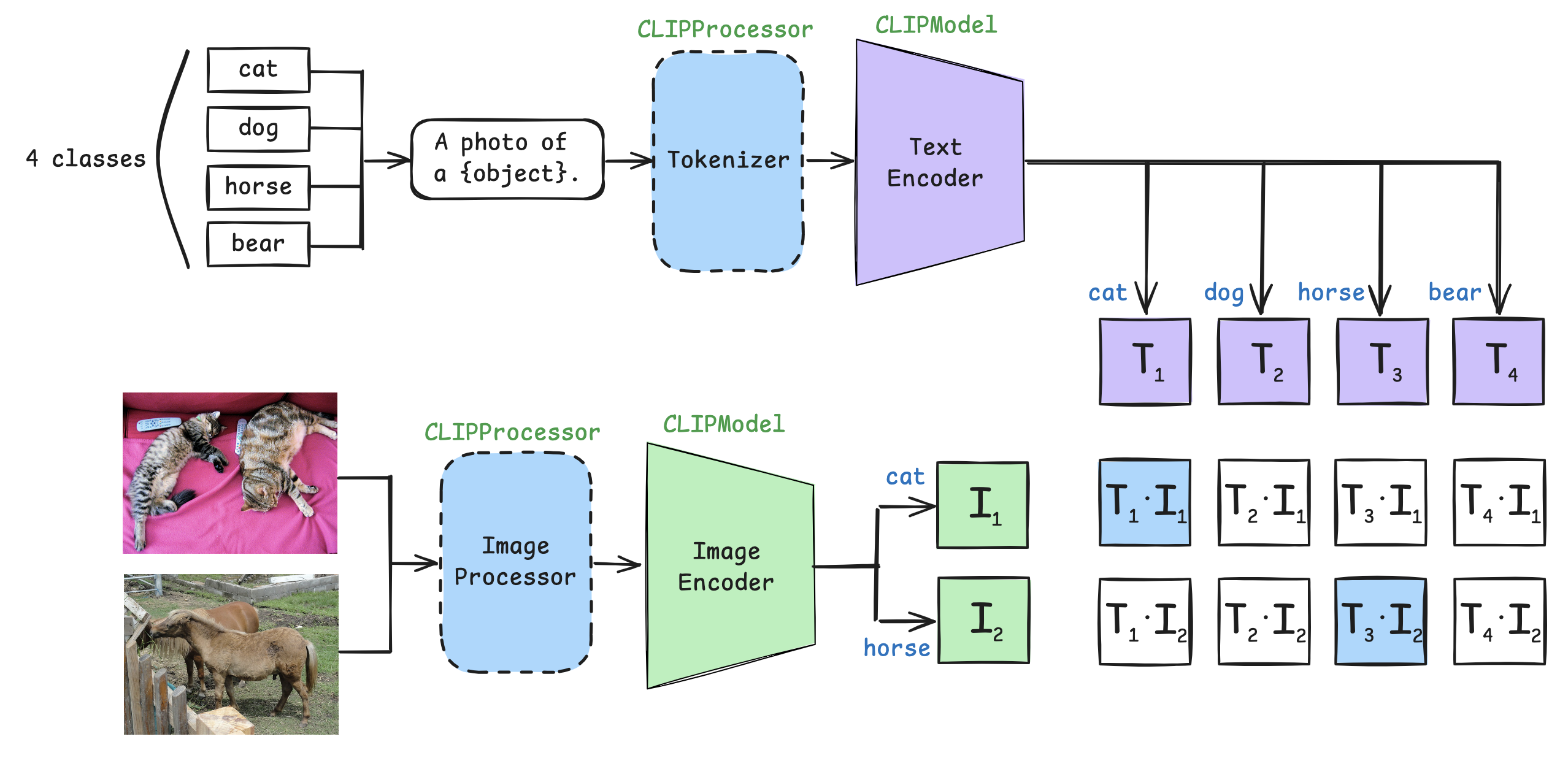 위 이미지 예시에서 '고양이'와 '말' 이미지를 Image Encoder의 입력으로 넣기 때문에,