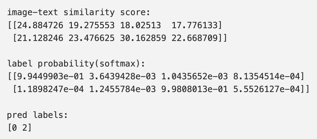 probs = logits_per_image.softmax(dim=1) # take the softmax to get the label probabilities