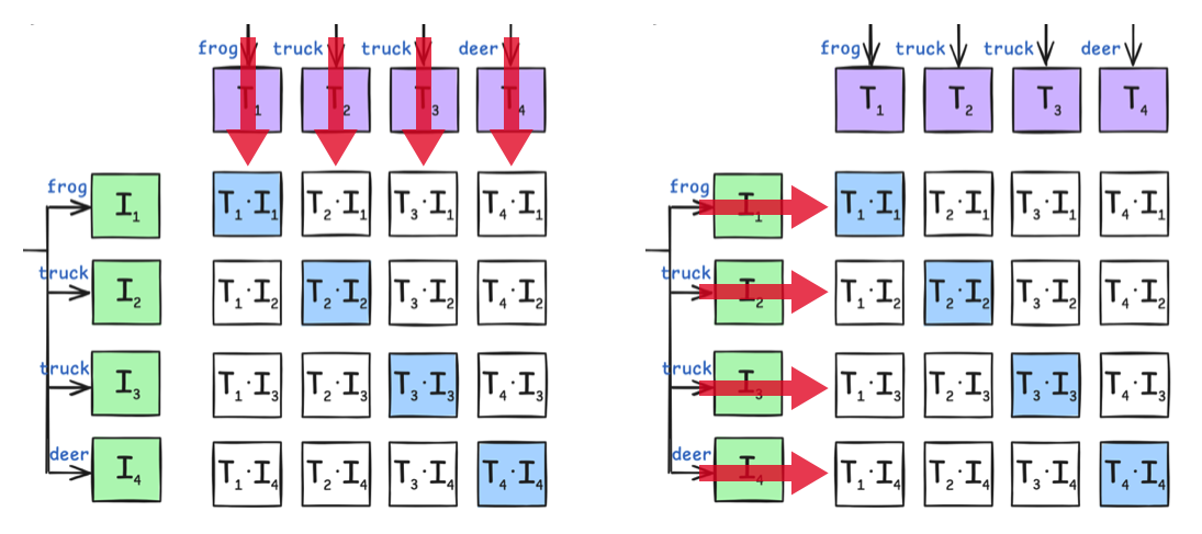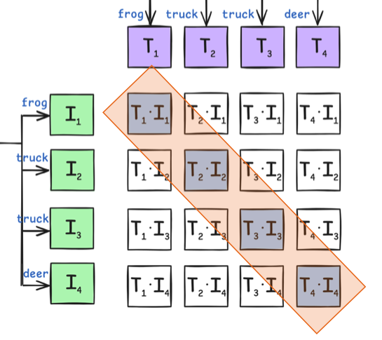 - 동일한 image-text pair의 embedding을 끼리는 서로 가까워야하기 때문에 dot product 값이 커야한다.