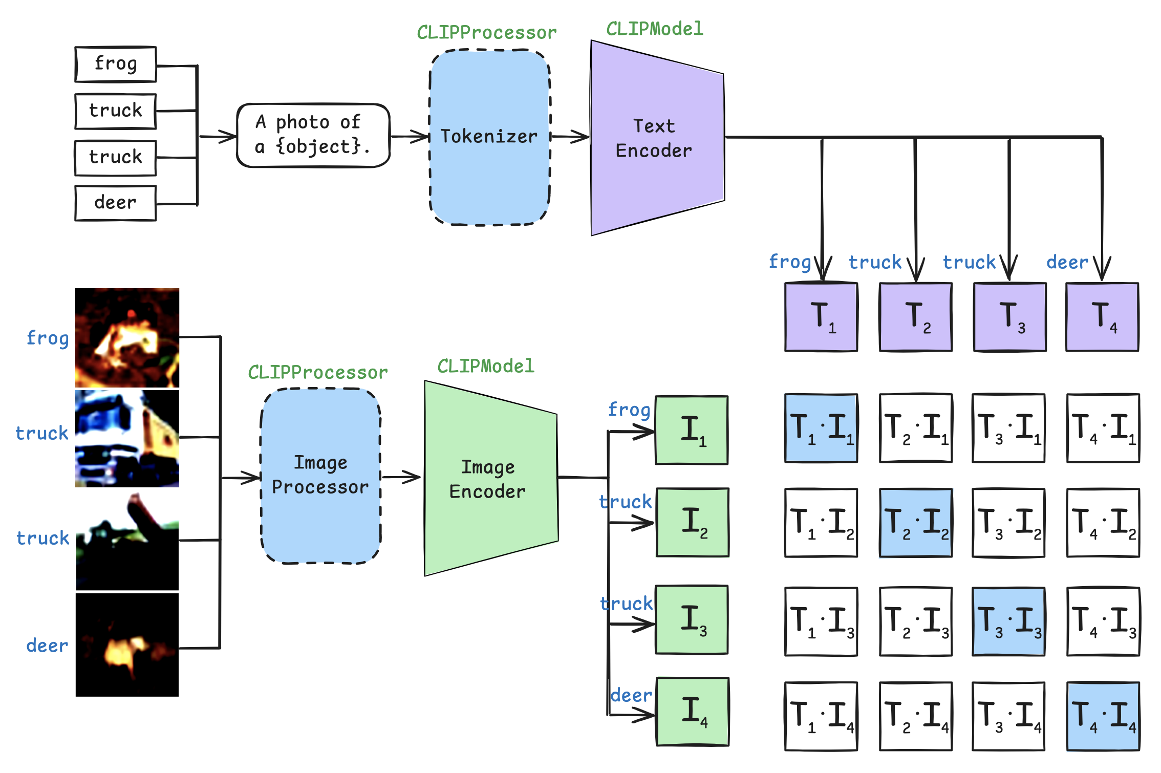 - 동일한 image-text pair의 내적값이 최대화되도록 학습을 진행시킨다.