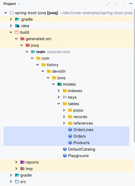 generateJooq task를 실행시키면 앞서 설정에 맞춰 build/generated-src/jooq/main 하위 디렉토리에 코드가 생성되어있음을 확인할 수 있다.