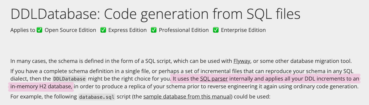 특히 SQL 파일로부터 코드를 생성하는 DDLDatabase의 경우 내부적으로 H2 DB를 사용하여 코드를 생성한다.