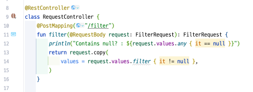 아래 컨트롤러 코드를 살펴보면 요청 필드는 non-null String을 generic으로 설정한 List이다.