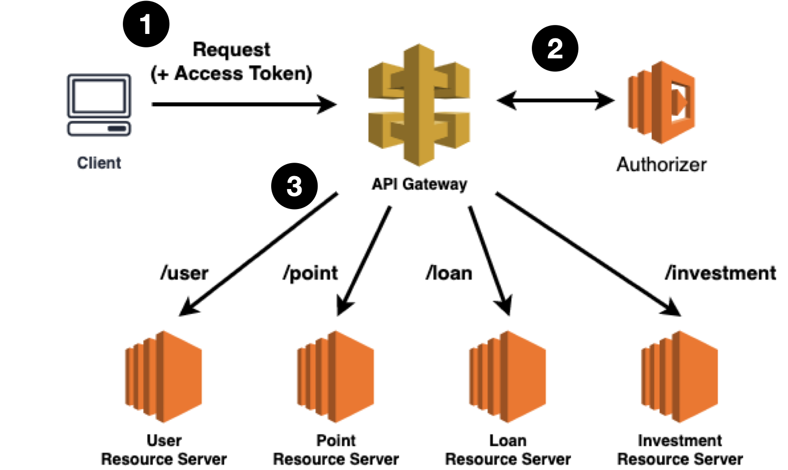- Client는 발급 받은 Access Token을 담아 API Gateway로 요청을 보낸다