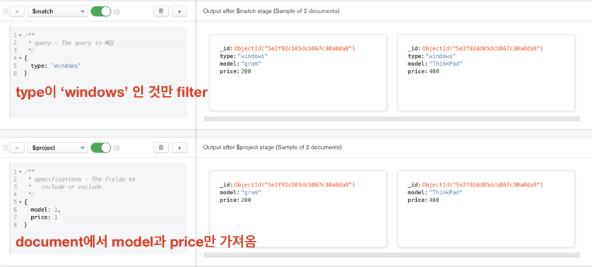 Compass의 Aggregate를 사용하면 다음과 같이 Pipeline stage 별로 결과를 확인할 수 있다.