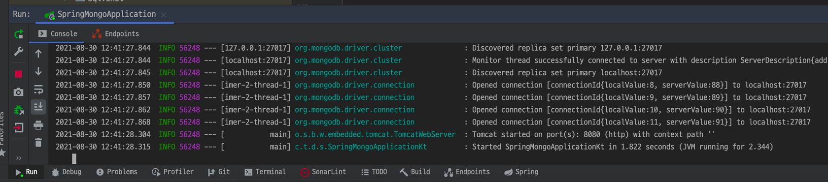 위와 같이 설정한 후 Spring Boot Application을 실행하면 아래와 같이 MongoDB와 연동이 잘 되는 것을 확인할 수 있다.