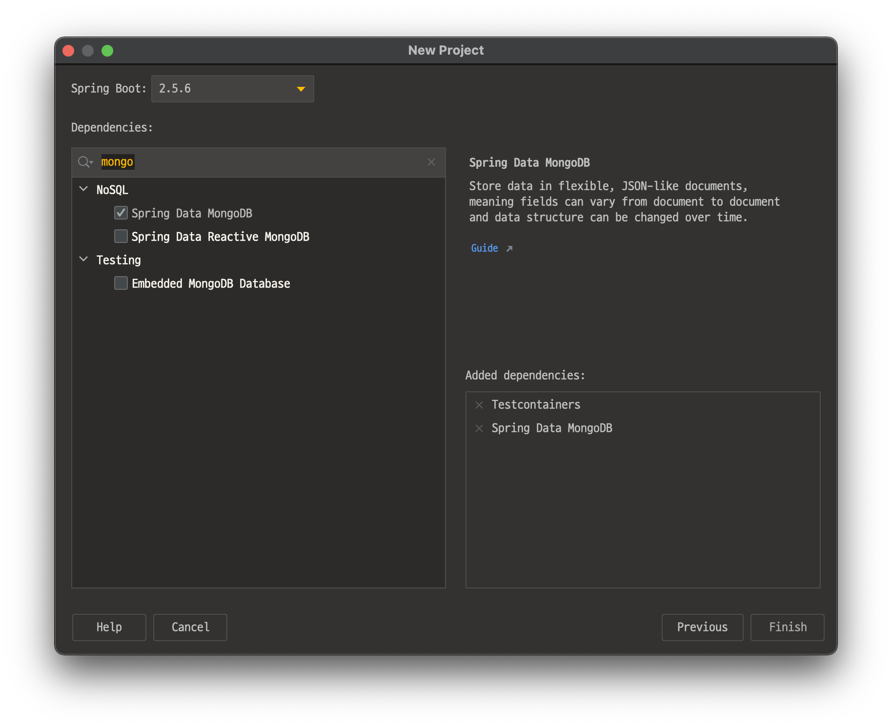 Spring Boot 프로젝트를 아래와 같이 Spring Data MongoDB, Testcontainers 의존성을 추가하고 생성한다.