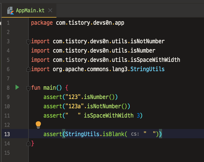 package com.tistory.devs0n.app import com.tistory.devs0n.utils.isNotNumber import com.tistory.devs0n.utils.isNumber import com.tistory.devs0n.utils.isSpaceWithWidth fun main() { assert("123".isNumber()) assert("123a".isNotNumber()) assert(" " isSpaceWithWidth 3) }