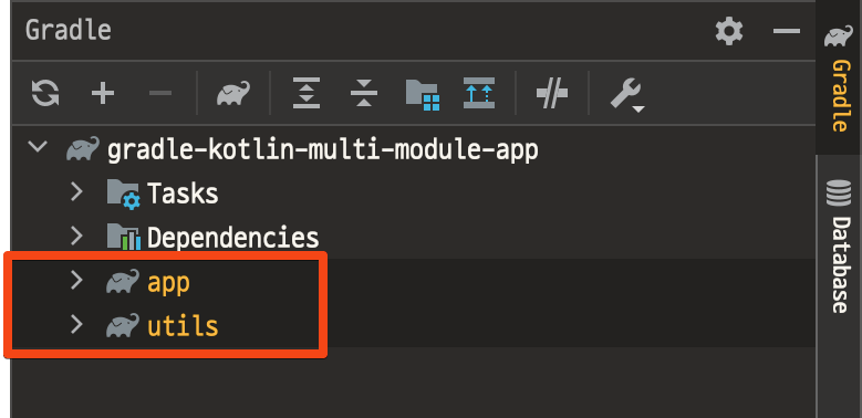 모듈 설정을 마친 후 build를 하면 IntelliJ IDE를 사용하는 경우 Gradle 탭에 아래와 같이 app, utils 모듈이 root 프로젝트 하위에 속해있는 것을 확인할 수 있다.