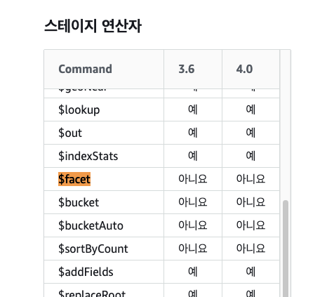 아까 사용한 $facet이 왜 안됐을까하니 지원되지 않는 연산자라고 나온다.