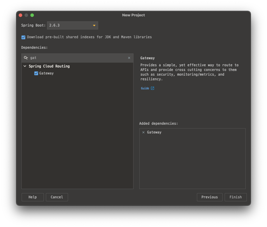 API Gateway 서버는 Spring Cloud Routing > Gateway dependency를 추가하여 생성하도록 한다.