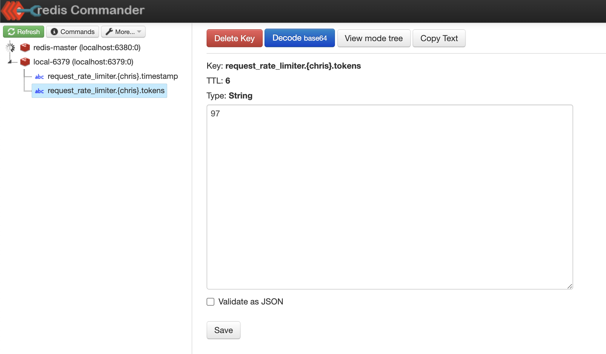 Redis에는 request_rate_limiter.{key}.tokens, request_rate_limiter.{key}.timestamp 이렇게 2개의 Key가 저장되어 있을 것이다.