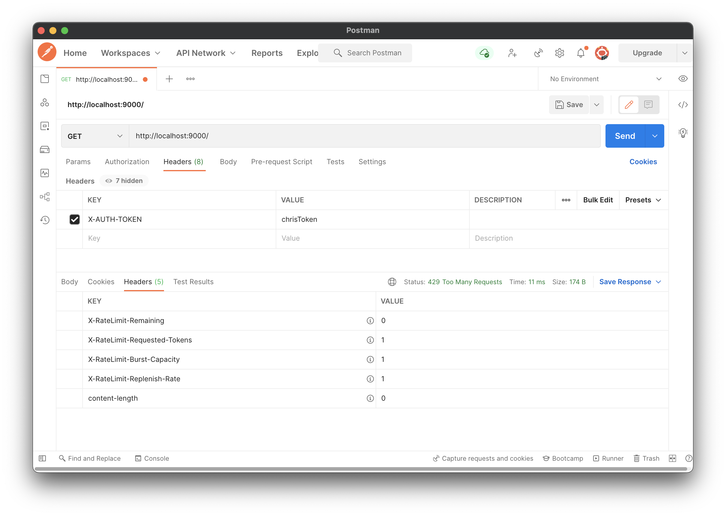그러면 아래와 같이 429 Too Many Requests 상태 코드와 Rate Limit 관련된 header가 응답으로 오는 것을 확인할 수 있을 것이다.