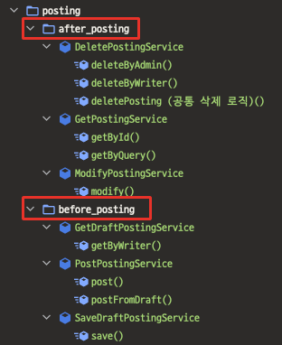 그런 경우 아래와 같이 포스팅 삭제와 관련된 operation을 하나의 Service 클래스에 두는 것이다.