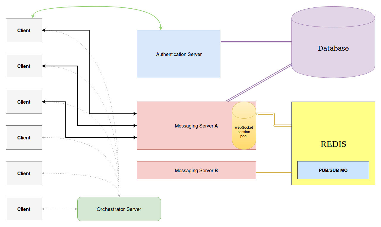 클라이언트와 서버가 연결되어있는 Stateful한 웹소켓 서버의 경우, Scaling out을 했을 때 서로 다른 웹소켓 서버에 붙은 클라이언트 끼리 통신이 필요하기 때문에 클러스터링을 위한 인프라 구성이 추가로 필요하다.