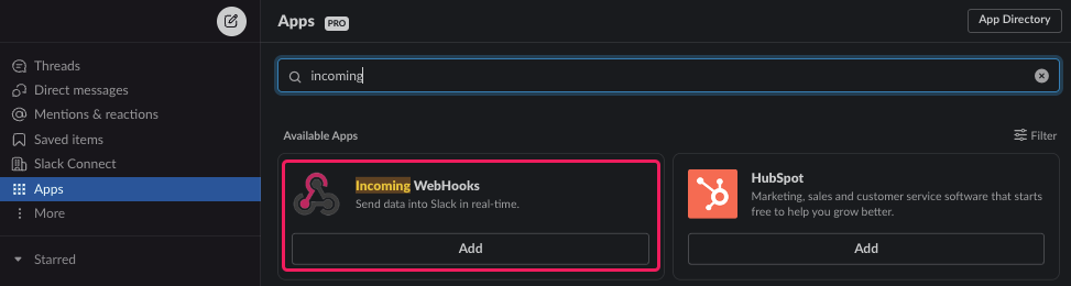 Apps에서 Incoming WebHooks를 검색하여 추가를 할 때 간단한 설정만 해주면 된다.