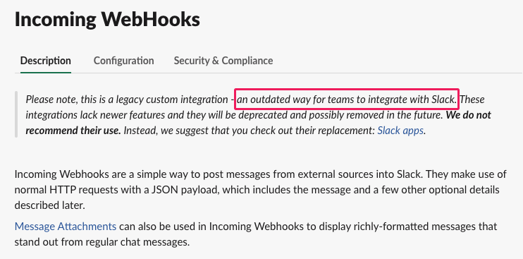 앞서 살펴본 Incoming WebHooks 기능은 매우 편리하지만 Slack에서는 이를 사용하는건 지양하고 있다.