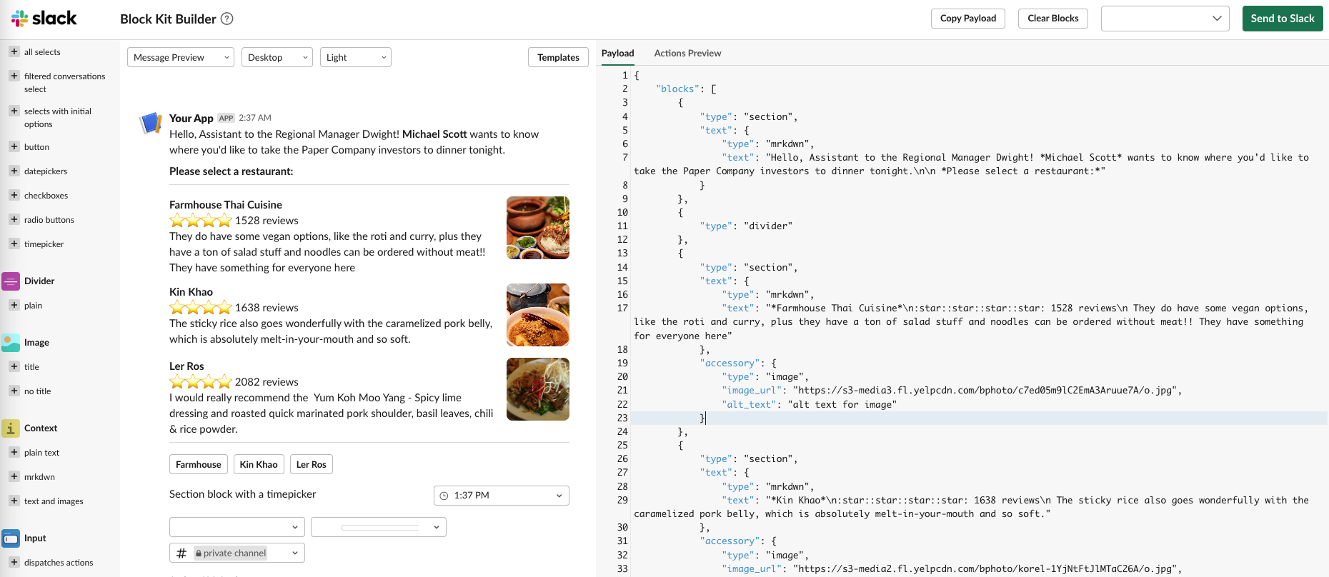 그리고 만든 메세지 block에 대한 payload를 우측에 보여주기 때문에 HTTP 요청을 할 때도 사용해도 되고 SDK를 사용할 때도 사용할 수 있다.