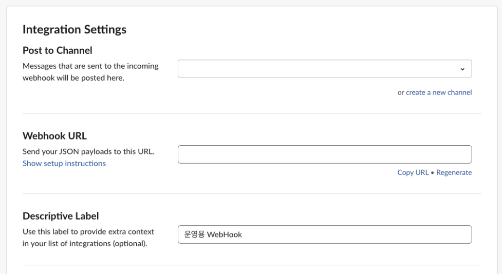 Apps에서 Incoming WebHooks를 검색하여 추가를 할 때 간단한 설정만 해주면 된다.